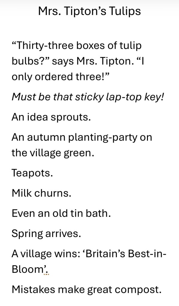 Well, how blooming marvellous it was to wake up this morning and discover that “Mrs Tipton’s Tulips” had received an Honourable Mention in this fantastic Kids Lit competition.